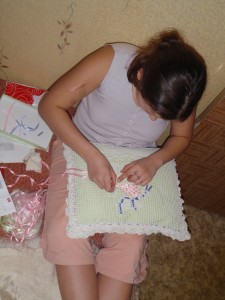 А теперь надо маме помочь оформить саму девочку на подушке, Начнем с шапочки. Вот какую красивую шапочку сделала Анжелочка