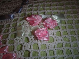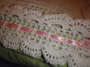 Используемые материалы: пряжа Mondial Cable 8 50гр/300м (~2 мотка, т.е. ~100гр/600м), крючок №1, синтепон, тик, лен, потайная молния, атасные ленты розового, голубого и зеленого цветов и конечно же зажигалка! (для ленточек =) )