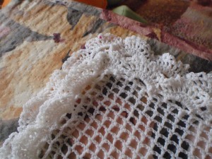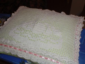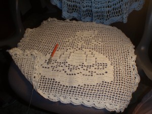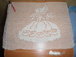 Сначала я с Анжелой начала вязать филейкой лицевую часть подушки. Анжела старательно разматывала нитки…