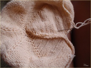 Потом разделила петли на 6 и начала убавлять через каждые 20-21 петлю провязывала по две петли вместе. Закончила вязать, когда у меня осталось петель 7-8, стянула их и нитку отрезала с таким расчетом чтобы хватило сделать трикотажный шов, без отрыва.