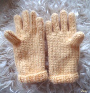 Как-то раз я вспомнила, что год назад я связала свои первые перчатки, но не до конца, т.к. надо было придумать манжеты. Недавно достала свой недовяз и поняла, что я соединила перчатки не так как надо… Вместо того чтобы сделать 2 перчатки – правую и левую, я сделала 2 левых :))))))) Одним словом пришлось распускать соединительный шов и соединять заново. Нитки достаточно пушистые и очень мягкие, но вяжутся в принципе легко. Распускать конечно сложнее. Название ниток не помню, покупала давно и этикетка потерялась